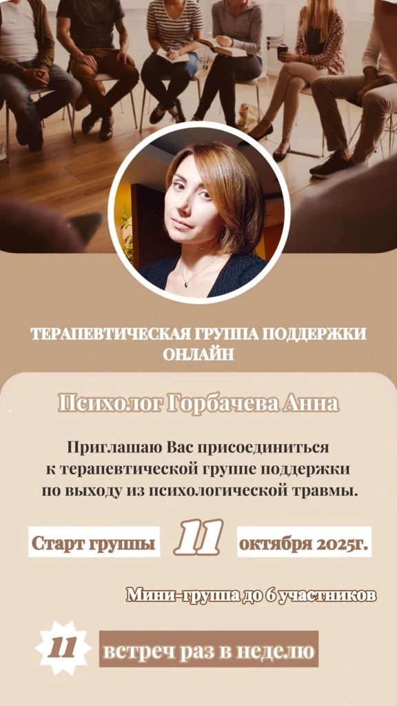 Терапевтическая группа поддержки для переживших травматический опыт помогает восстановлению утраченных связей. Каждый участник снова может ощутить себя понятым, принятым, почувствовать свою принадлежность среди таких же, как и он. Получить сопричастность и поддержку на своем пути к исцелению или запросить конструктивную обратную связь для дальнейшего развития💡