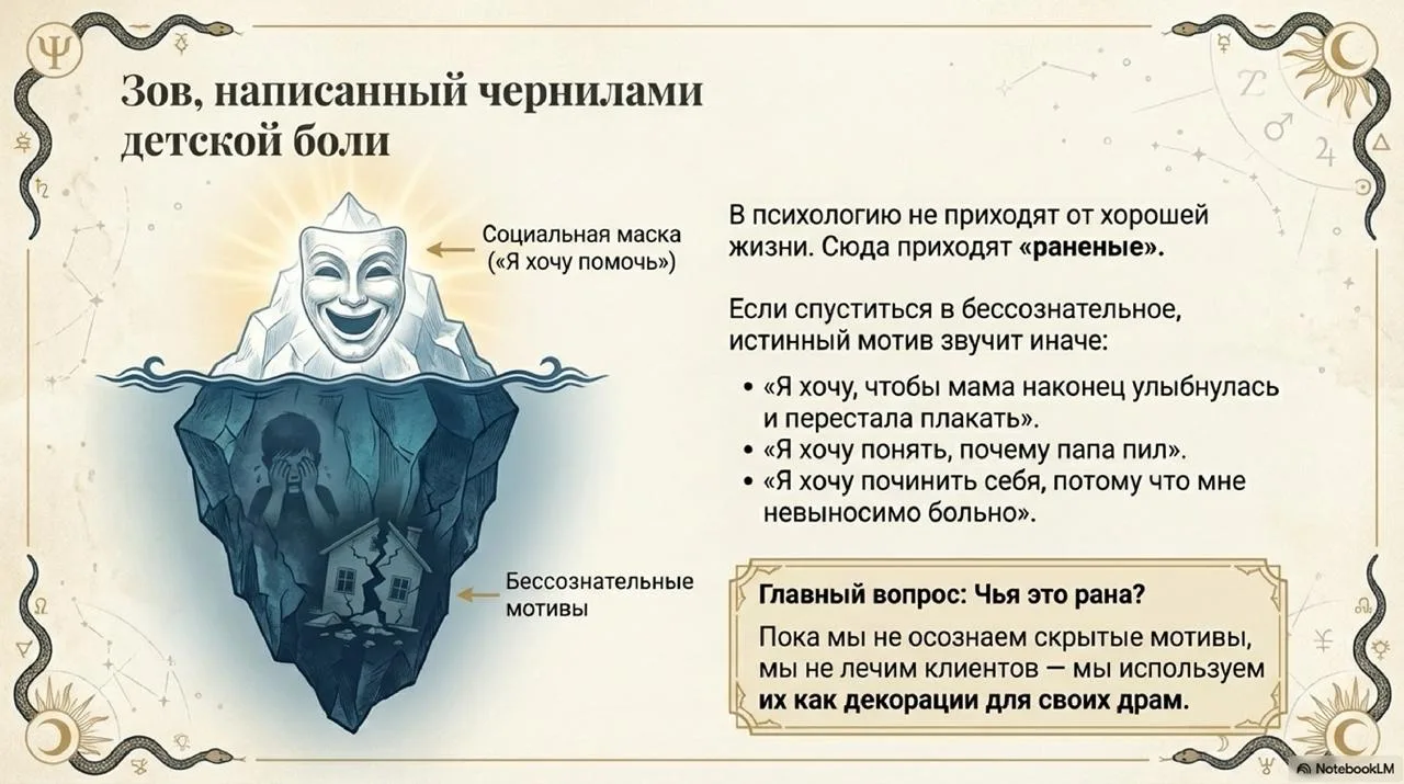 В нашей профессии Зов звучит тише, но настойчивее. Сначала мы слышим его как простое «Я хочу помогать людям». Но если прислушаться, за этим стоит приглашение в Великое Путешествие. Это приглашение спуститься в глубину, встретиться с Тенью и вернуться обратно, чтобы стать проводником для других.