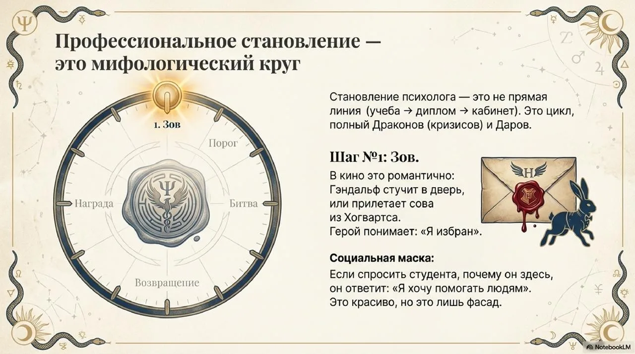 Мы привыкли думать, что стать психологом — это линейный процесс: ВУЗ ➡️ Диплом ➡️ Кабинет. Но на самом деле профессиональное становление — это Мифологический Круг. Это цикл, полный Драконов, Порогов и, конечно же, Даров.