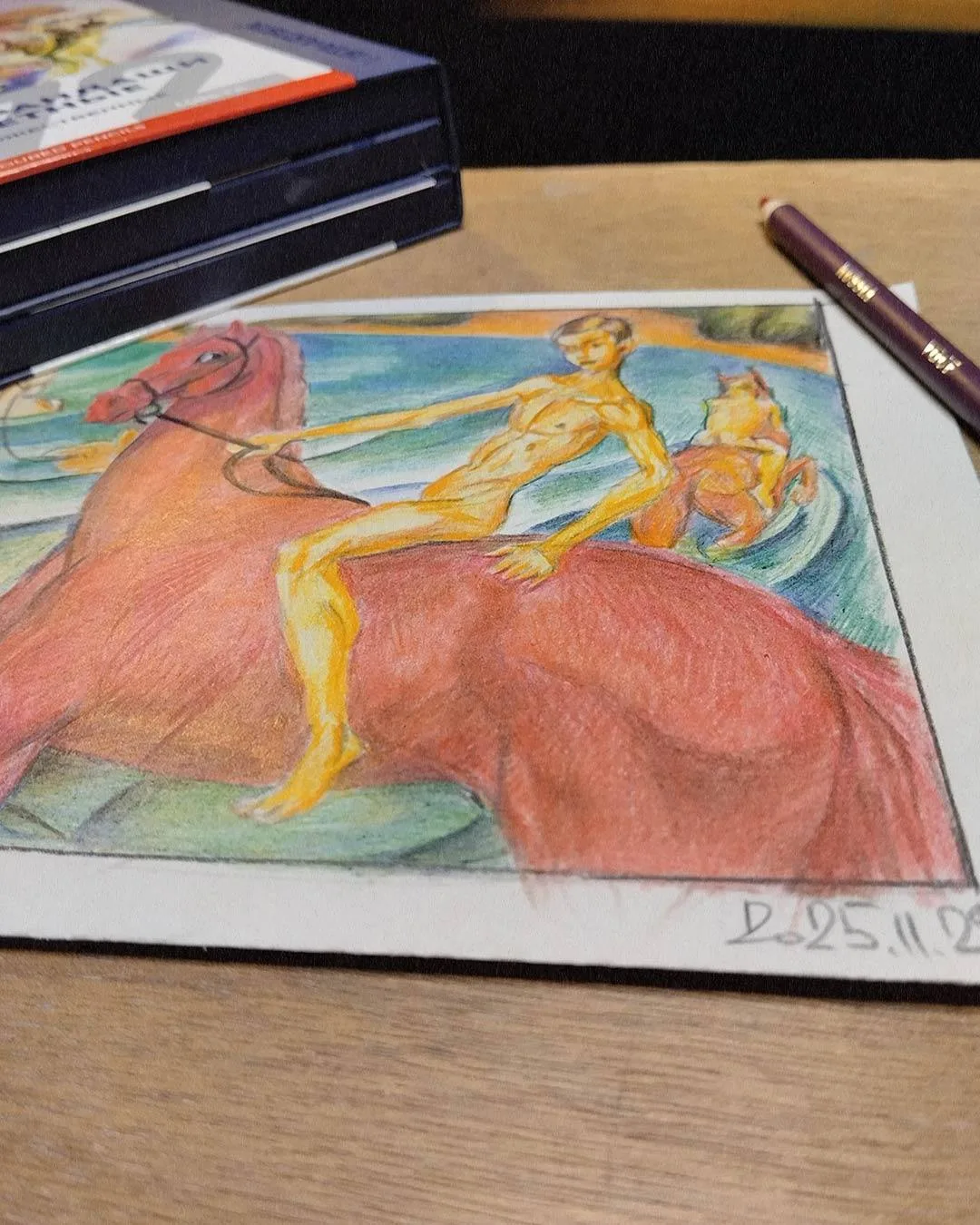 Копия — карандаш, пастельные карандаши (красный, оранжевый, голубой, белый), бумага, А5.