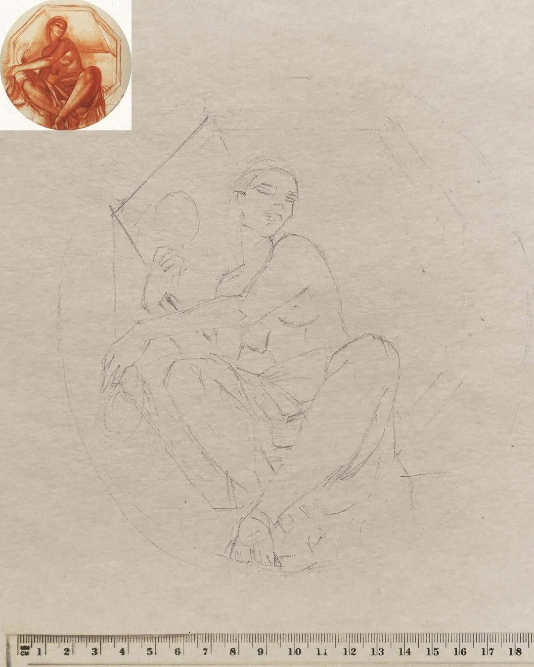 Предварительный набросок сделан простым карандашом, рисунок — чёрным карандашом и мелом.