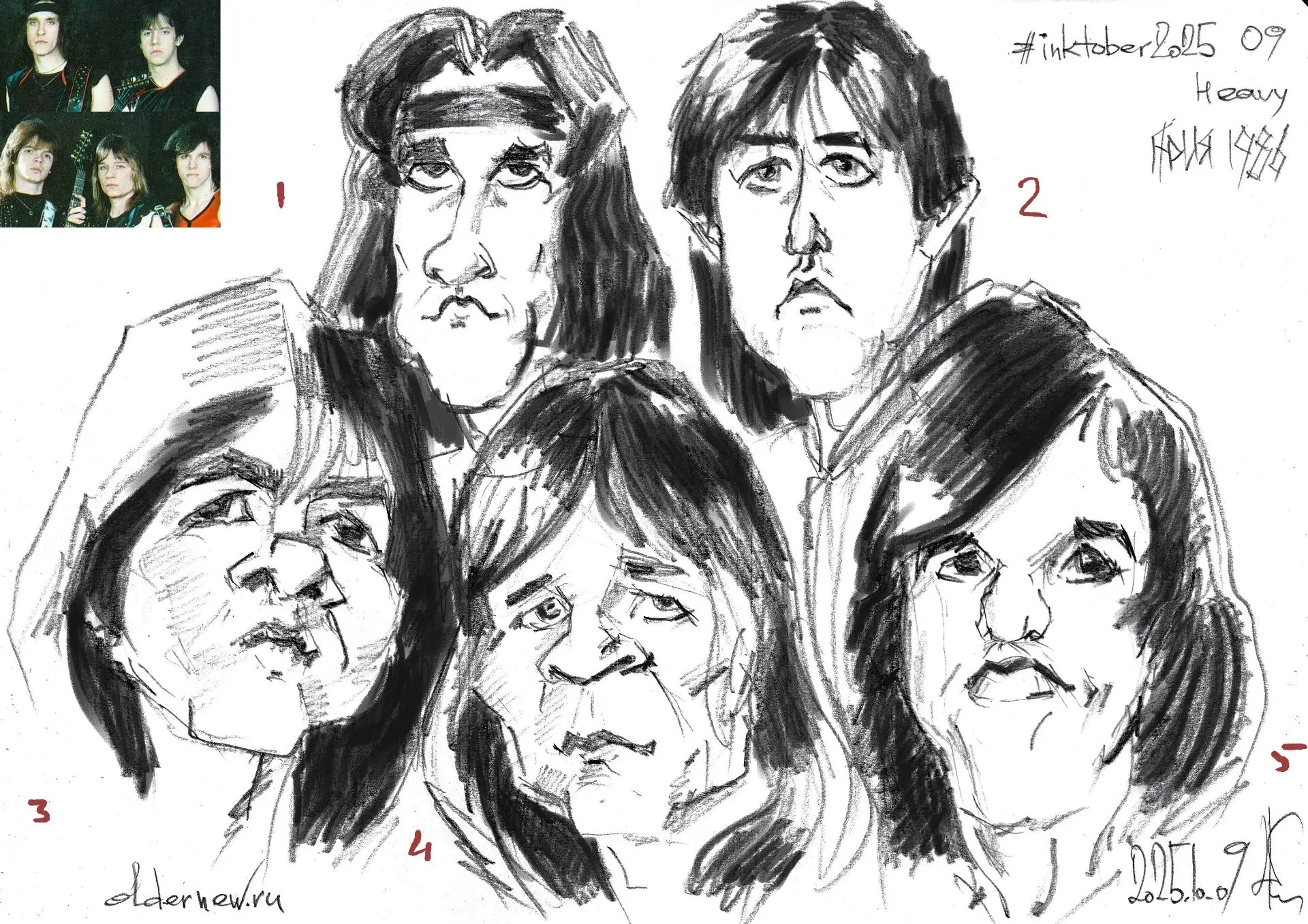Сегодня для инктобера не "угадайка"😎Хотя... интересно узнать, кто из них получился? В порядке узнаваемости. Для удобства я их даже пронумеровал. Пофамильно всех не знаю. Это ранний состав Арии, на первом году существования (1986). По-моему, они там там ещё долго перетасовывались. Знаю только Кипелова😎.