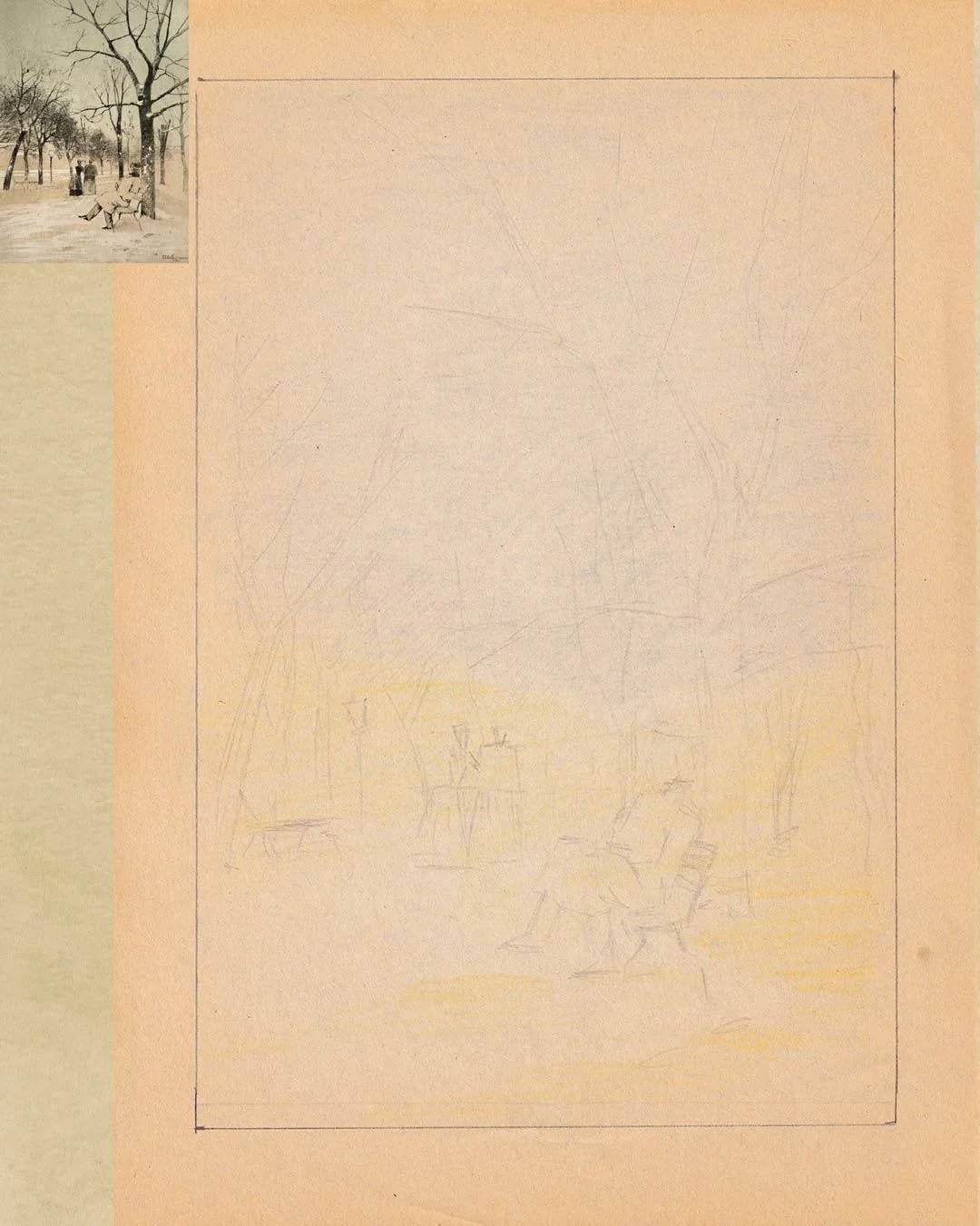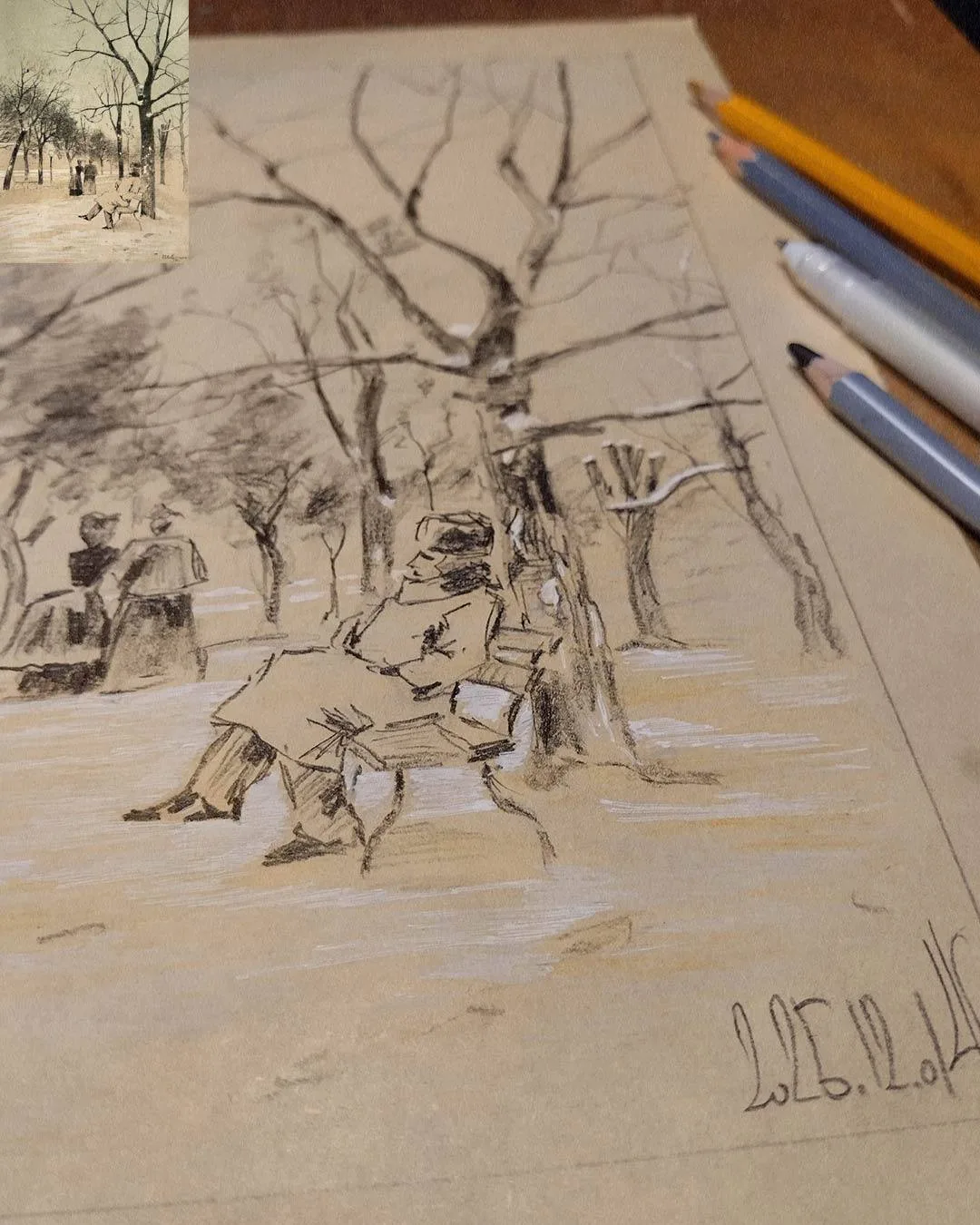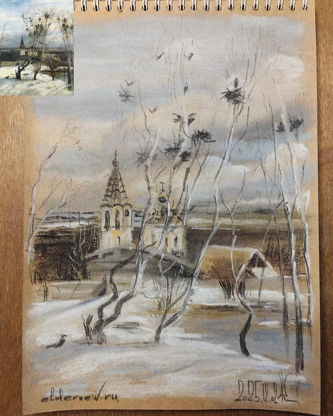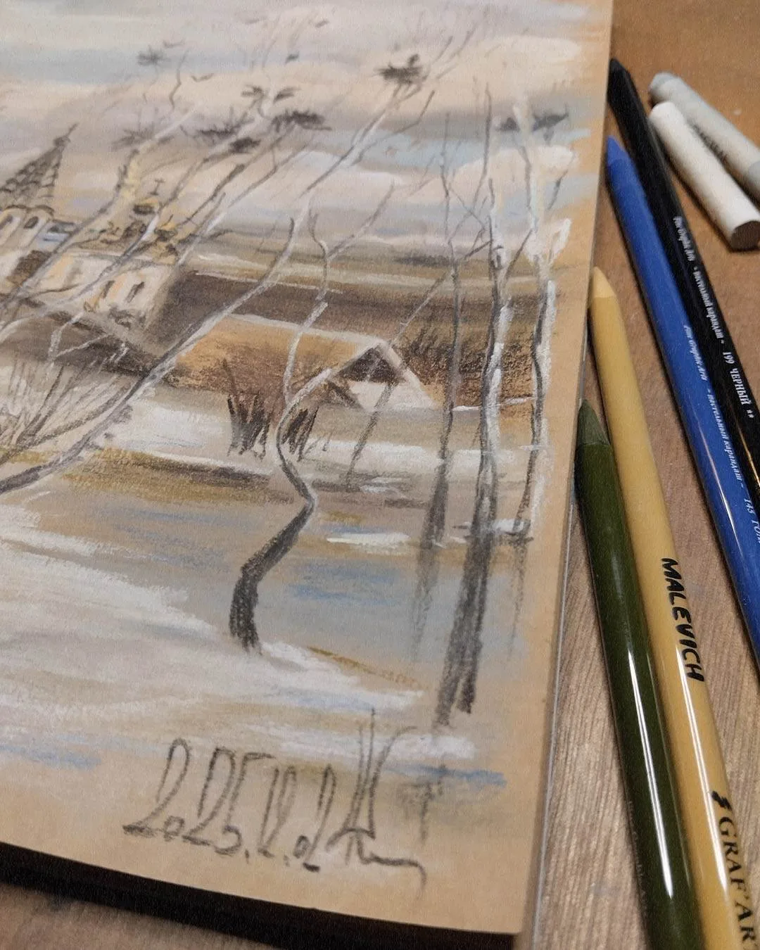 Хотел на крафте нарисовать, но как-то сразу не нашёл, а под руку попалась старинная (ещё советских времён) писчая пожелтевшая бумага А4. По такой нежной бумаги тонировку решил сделать мягкими цветными карандашами, а сам рисунок — угольным карандашом и белым пастельным карандашом. Но оказалось, что по слою цветного карандаша уголь и пастель проскальзывают, почти не оставляя следа. Пришлось рисовать очень мягким (14В, только приобрёл😎) простым карандашом, а снег делать белой гелевой ручкой (гуашь или акрил побоялся использовать, чтобы бумагу не покоробить).