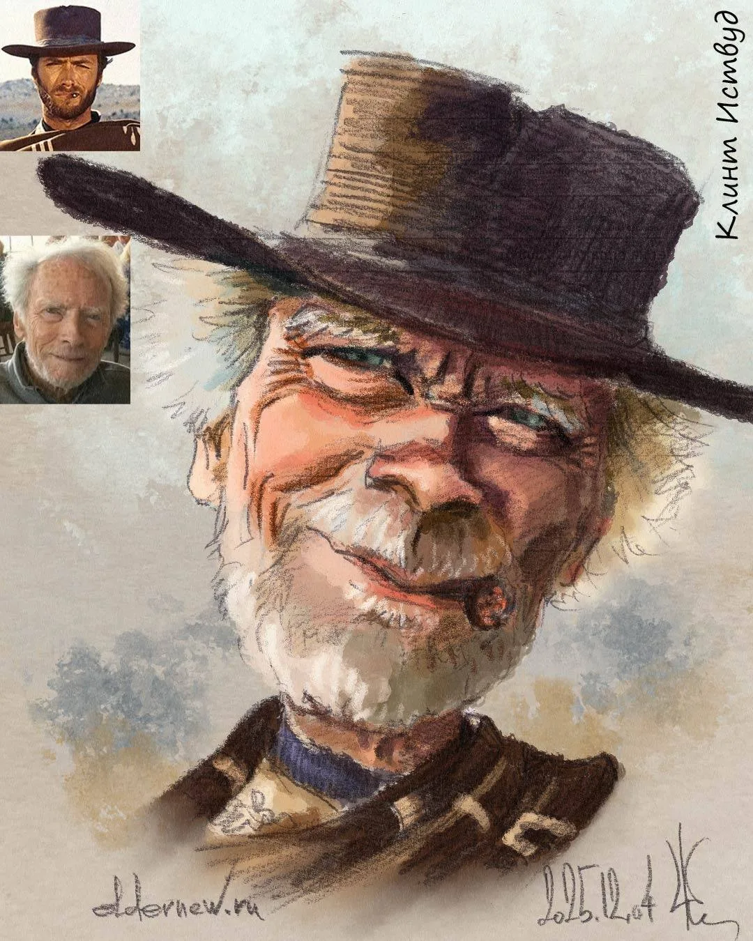 Попалась публикация с заголовком "Клинту Иствуду 100! Могучий старик!". Вспомнились вестерны с его участием... Тут же захотелось его изобразить😎. Нарисовал карандашом, раскрасил на компе. Хорошо, что решил проверить! Оказалось, что до 100 лет ему (Клинту) ещё больше 4 лет. Родился он 31 мая 1930 года. То есть сейчас ему 95. Тоже возраст немалый! Но не 100 же! А на фото из той публикации перед ним ещё и пирог стоял со свечками "100". Видимо, "прифотошопленный"😎Времена... Всё перепроверять надо!