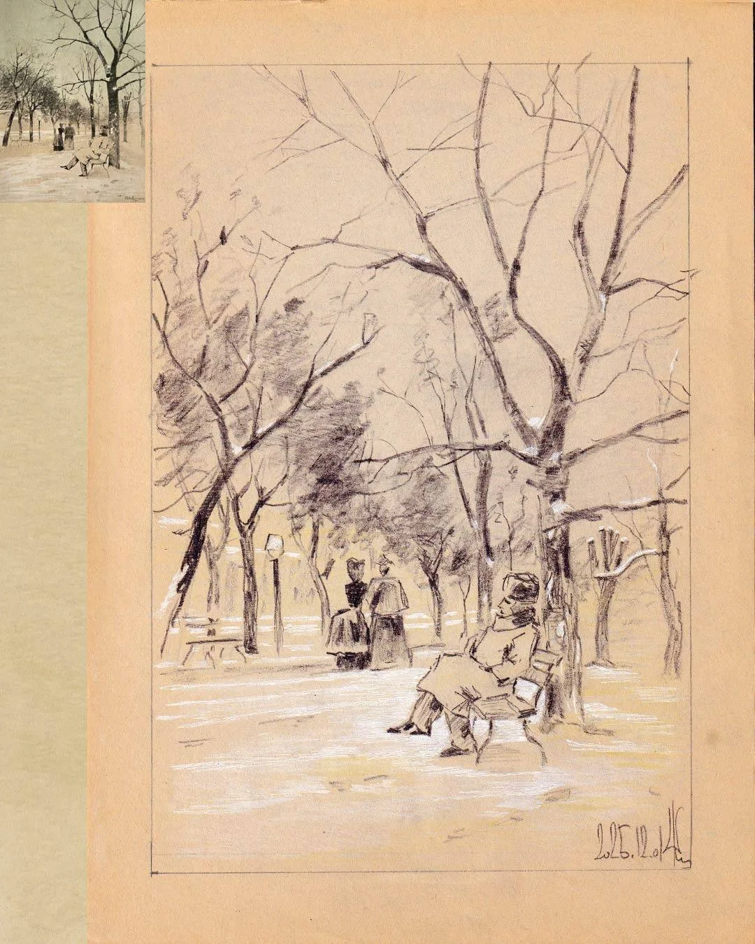 Исаак Левитан. «На бульваре» (Литография с тоном. 18×14 см) 1884 г.