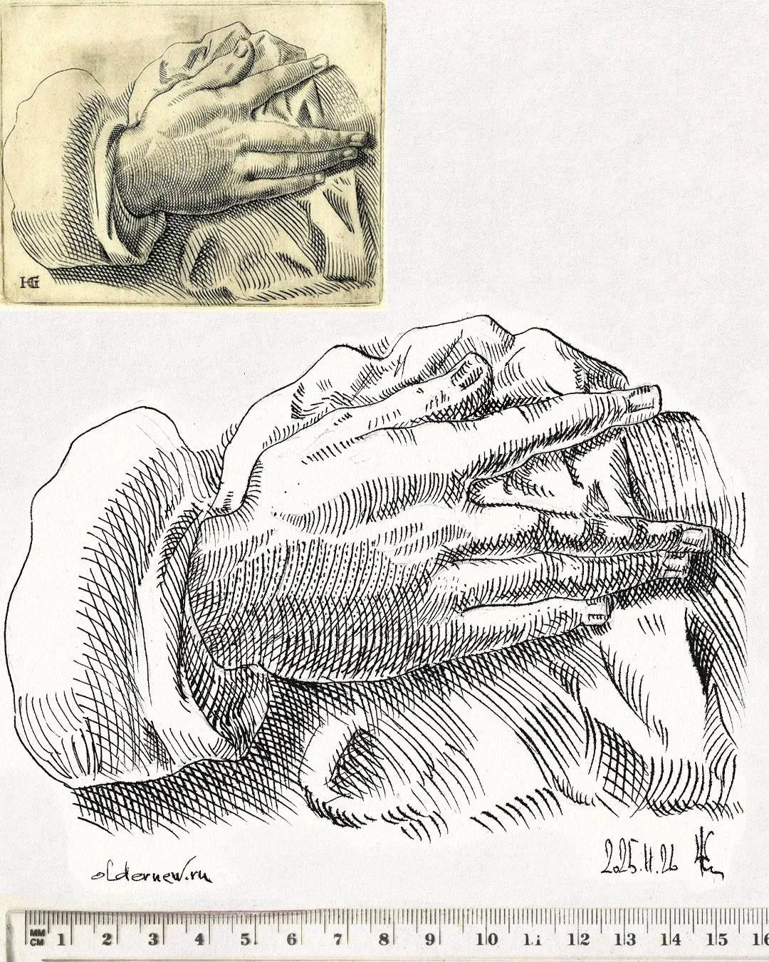 А на репродукции отчётливо видны карандашные линии... Или я чего-то не понимаю? Может быть так, что это не карандаш, а отпечатки лёгких набросочных царапин на пластине?