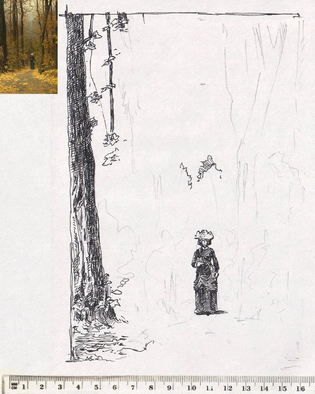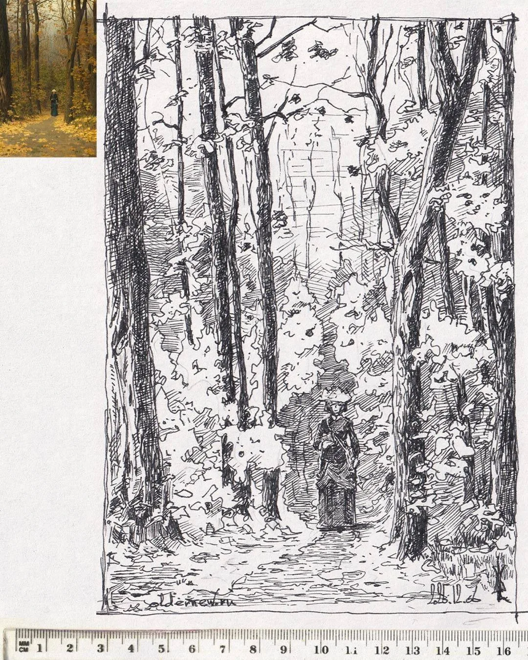 Решил взять кавалерийским наскоком... 3 раза "ХА"! При ближайшем рассмотрении оказалось, что Мастер (автор оригинала) сначала прорисовал КАЖДУЮ(!) линию карандашом, а только потом обвёл линии пером. Кстати, это говорит о том, что это не "гравюра", а рисунок пером🤔. Ведь по определению