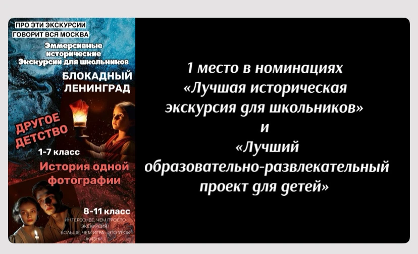 1 место в номинациях "Лучшая историческая экскурсия для школьников" и «Лучший образовательно-развлекательный проект для детей»