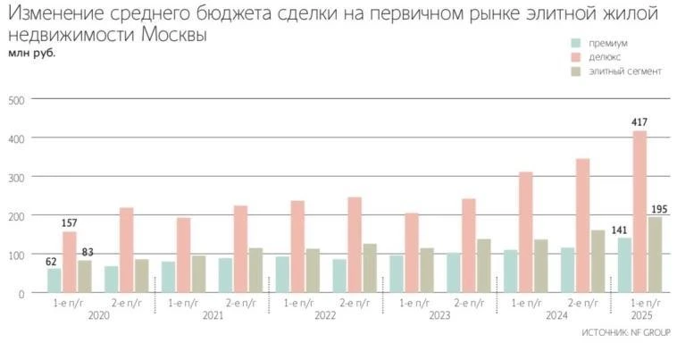 На московском рынке элитного жилья начался настоящий парад миллиардеров — средний чек сделки за первую половину 2025 взлетел до 195 млн рублей. Это почти в полтора раза больше, чем год назад, и на 70% выше, чем 2 года назад. «Квадрат» тоже не отстаёт — теперь он обойдётся в 1,7 млн рублей, а в некоторых проектах и вовсе подбирается к 2,2 млн.