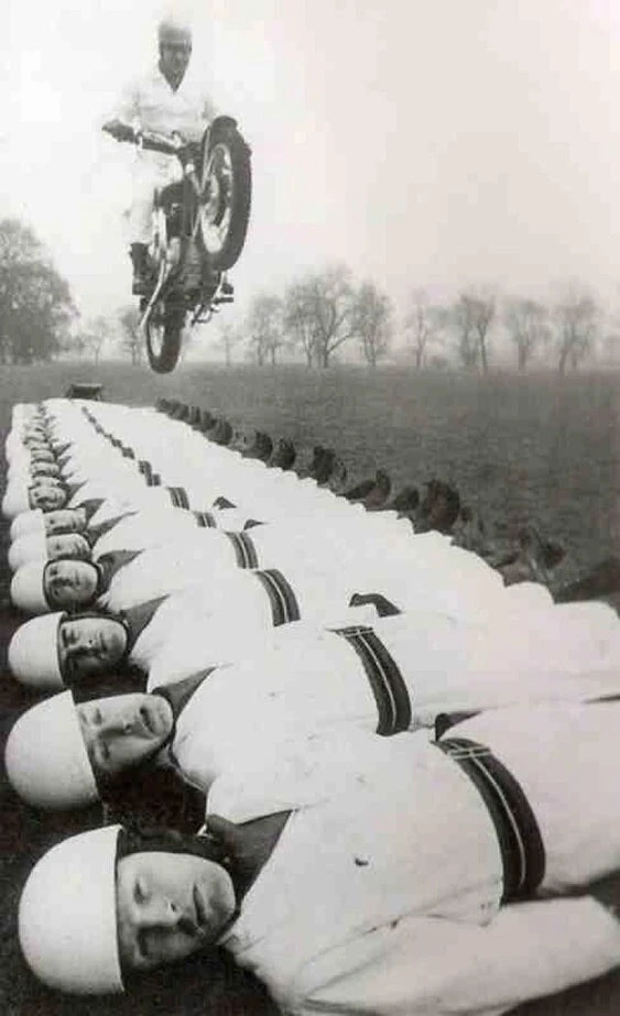 Том Гледхилл в 1966 году совершает прыжок на мотоцикле через строй из более чем 20 представителей Королевской артиллерии, разгоняясь до 72 км/ч.