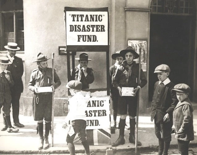 Бойскауты собирают пожертвования в помощь выжившим после крушения "Титаника", Англия, 1912 год.