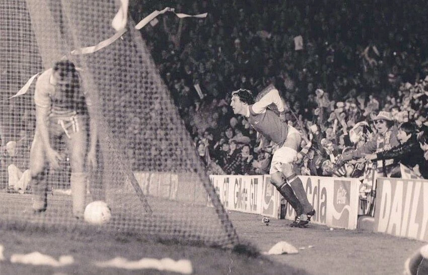 Игрок лондонского «Арсенала» Сэмми Нельсон празднует гол весьма эпатажно — стянув штаны и показав заднюю часть тела болельщикам соперников. 1979 год. Фотоаппарат