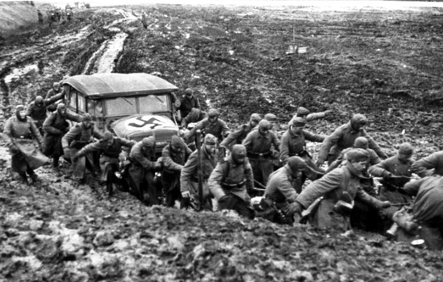 Немецкие солдаты пытаются вытащить застрявшую машину из грязи. СССР, 1941 год.