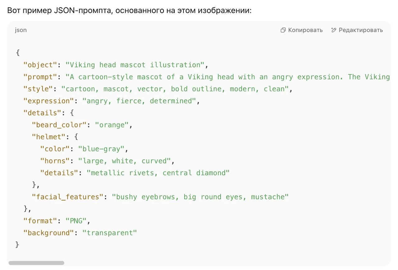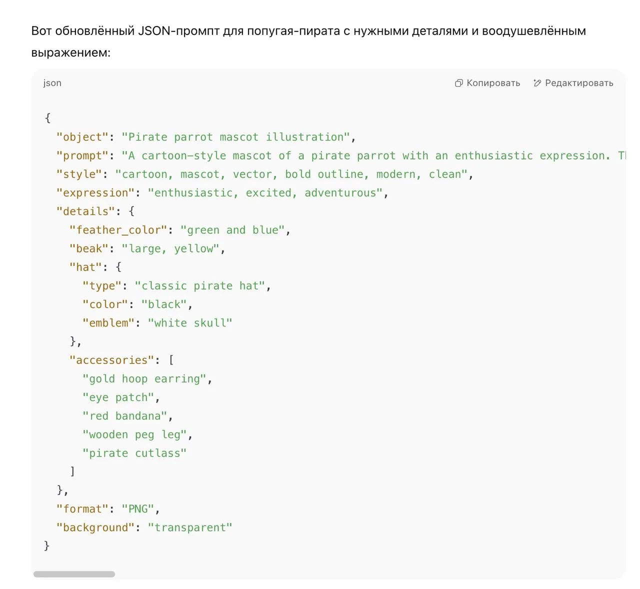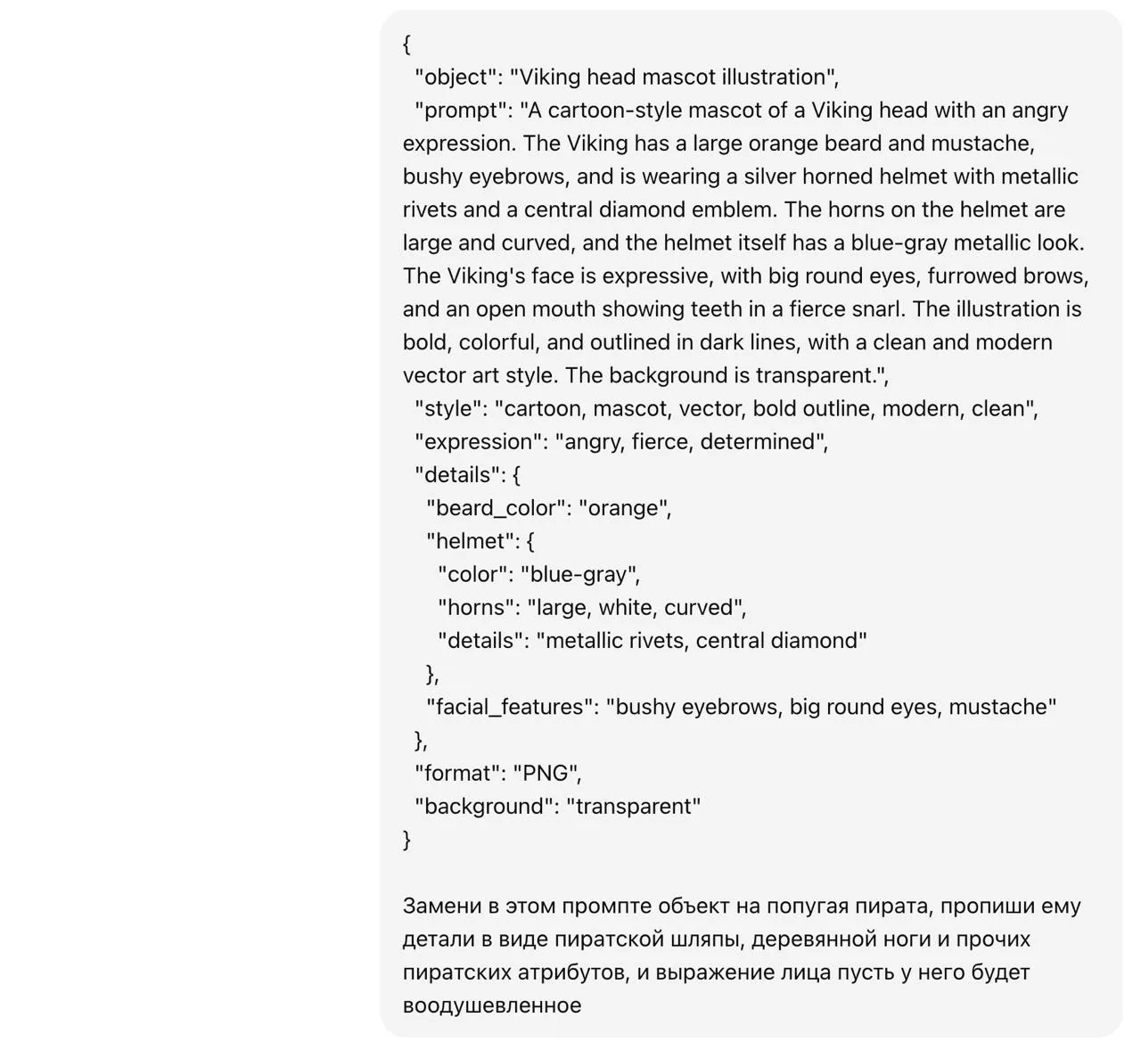 3. Если знаем английский — заменяем описание на то, что хотим получить. Если не знаем или лень замнять самому — просим нейросеть заменить значение тех ключей, которые нужно заменить. Сохранение ключей стиля, формата, фона гарантирует нам внешнее сходство новой картинки со старой
