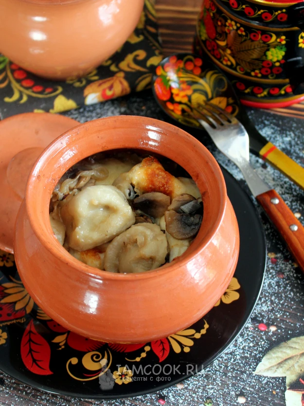 Разложите подготовленные пельмени по двум керамическим горшочкам.
