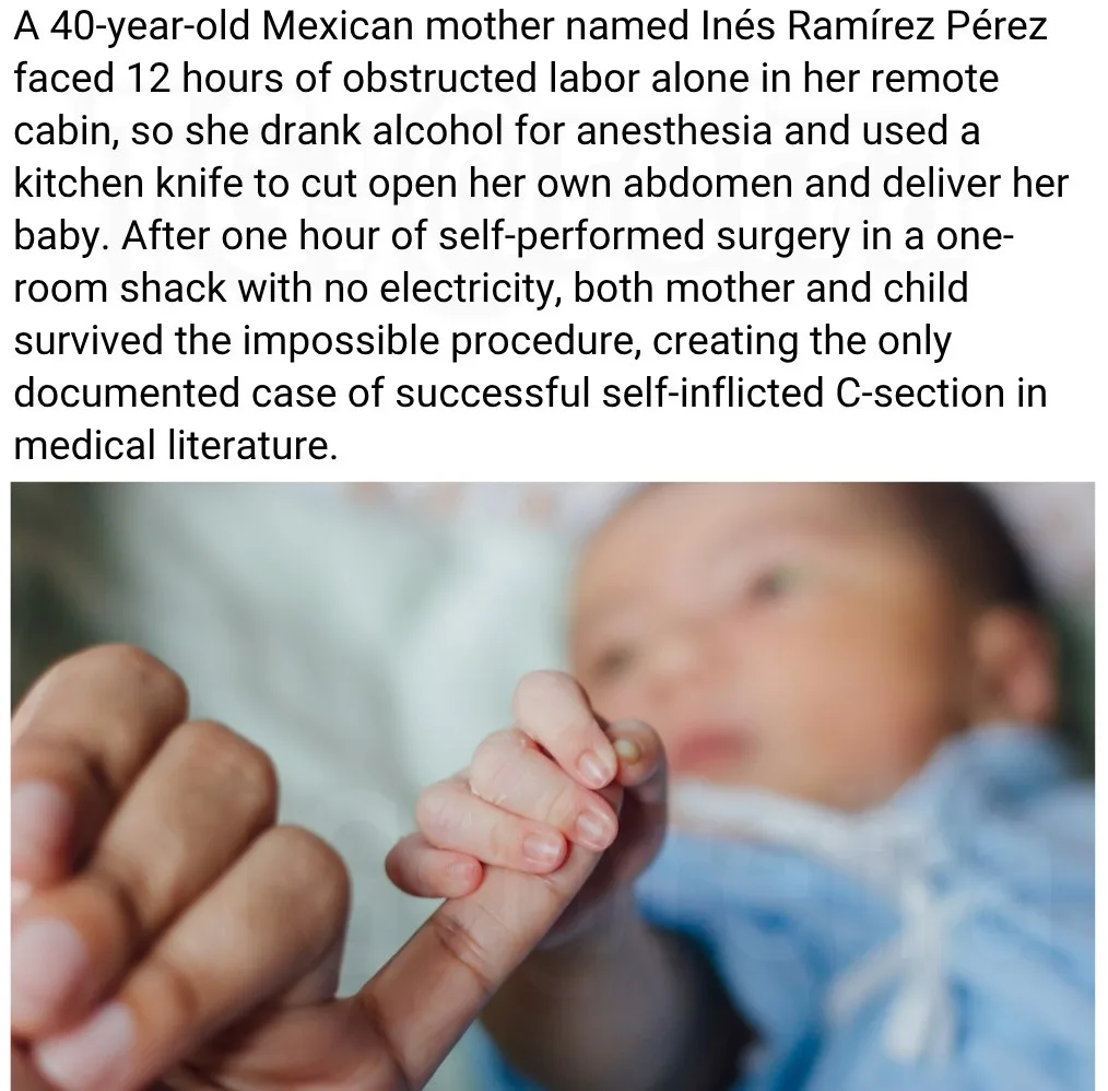 40-летнюю мексиканку Инес Рамирес Перес роды застали в её хижине, далеко от города. Ребёнок не выходил. Тогда, спустя 12 часов схваток, она выпила несколько стаканов спиртного в качестве обезболивающего, взяла кухонный нож и вскрыла себе чрево, сделав огромный разрез на животе. Операция заняла примерно час.