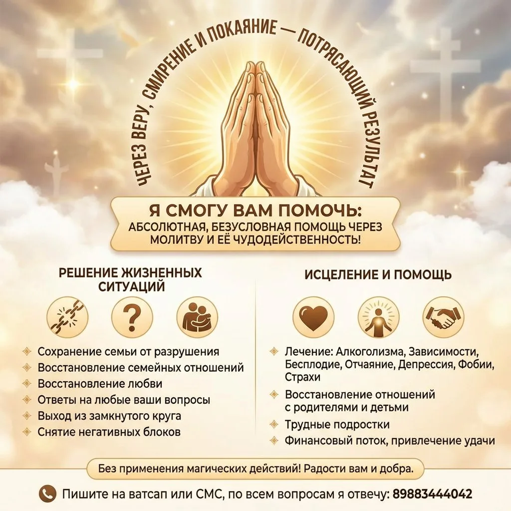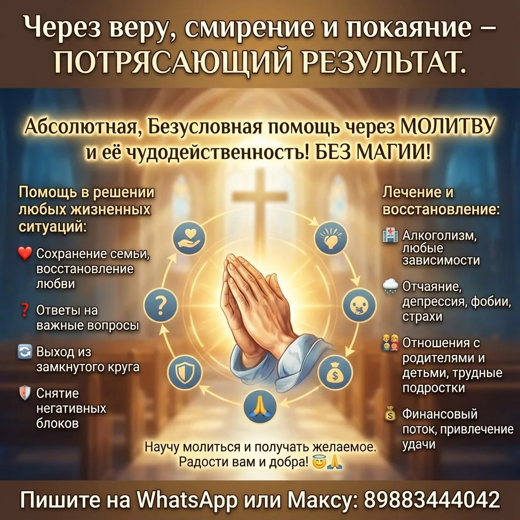 Снятие негативных блоков , любых жизненных разрушений в любом их направлении ., научу молиться и через молитву получать желаемое .