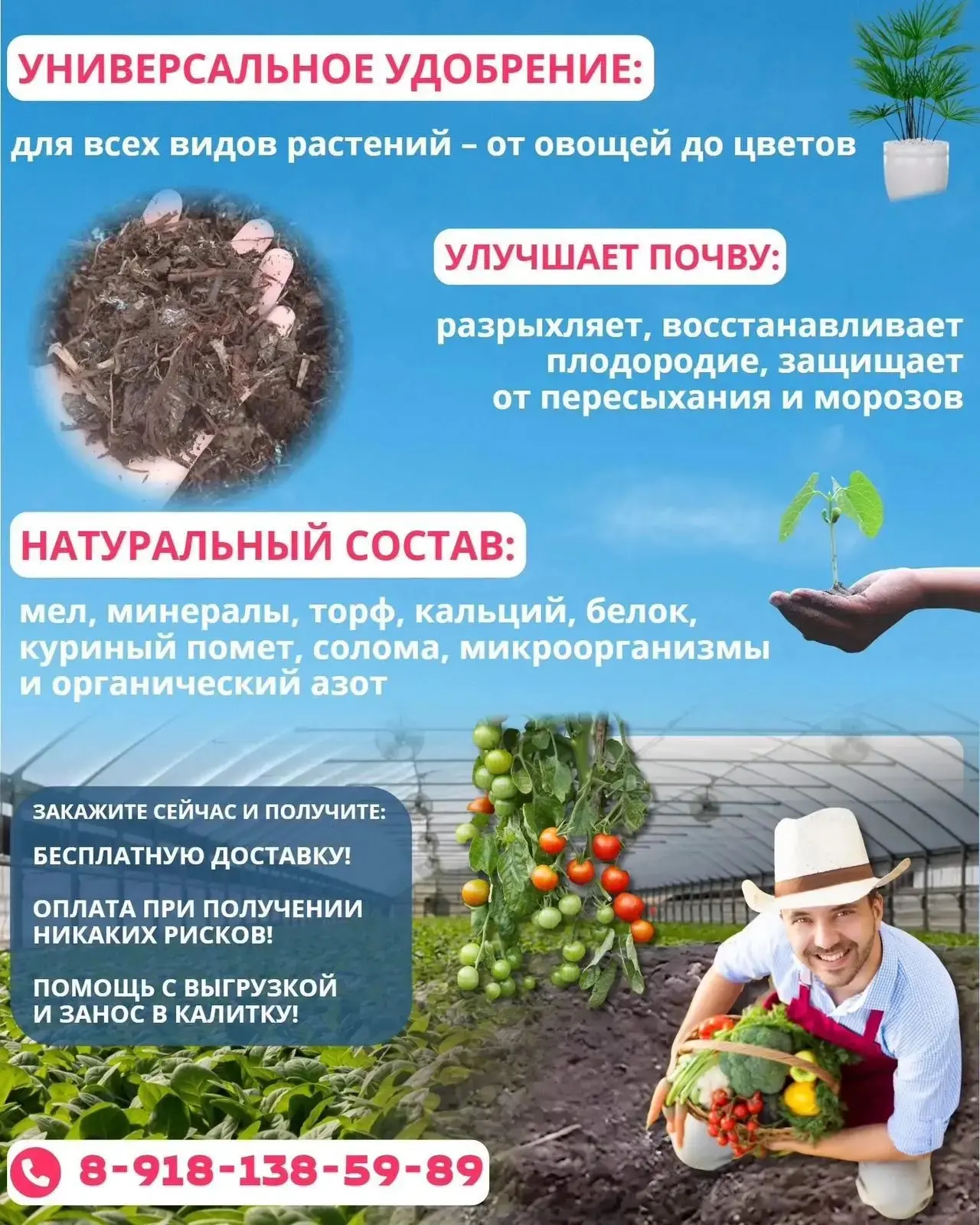 Доставка от .20.. 30-50 и более пакетов .Можно хранить несколько лет, не боится ни жары, ни мороза, разрыхляет почву, способствует восстановлению плодородного слоя почвы , защищает корни растений от перегрева и вымерзания, предупреждает образование земляной корки. Содержит: мел, минералы, торф, кальций, белок, куриный помёт,, солома, микроорганизмы и органический азот 2%. Это готовое удобрение используется круглогодично! 8918-138-59-89