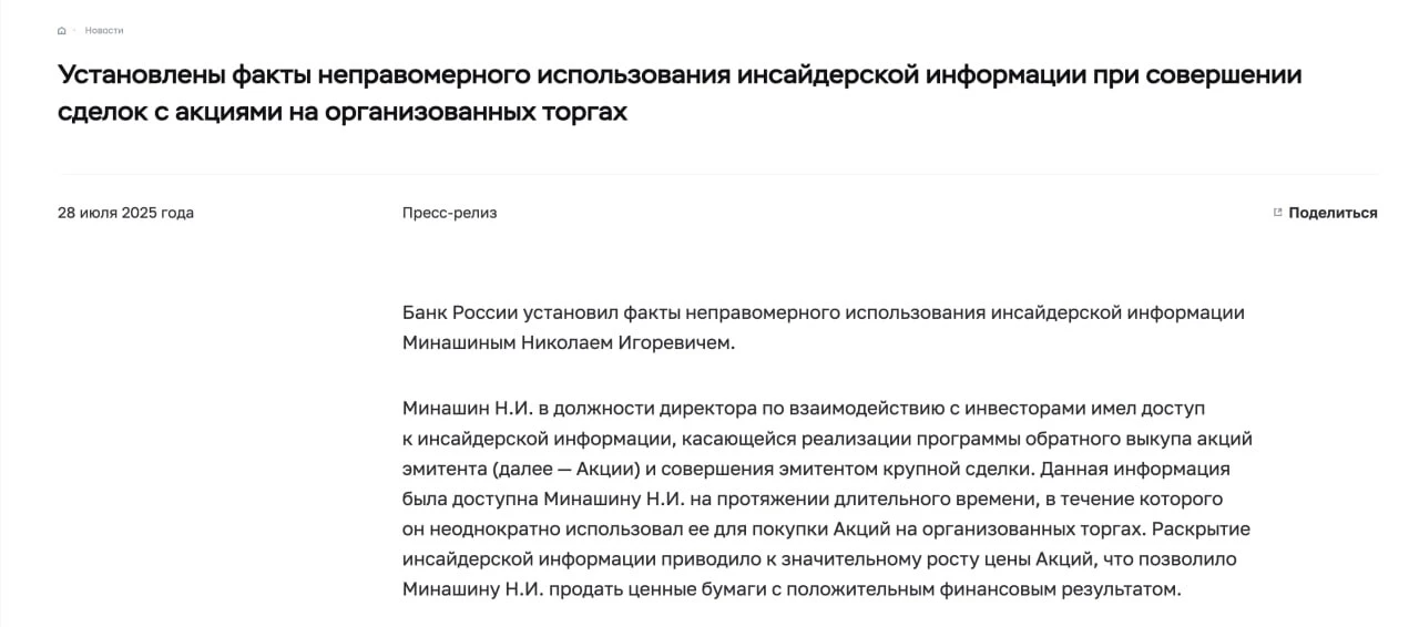 UPD: В пресс-службе "Самолета" прокомментировали, что компания действует в полном соответствии с требованиями законодательства по защите инсайдерской информации и активно содействует расследованиям регулятора. Все доступы к конфиденциальной информации регулярно проверяются на соответствие с должностными обязанностями сотрудников. Николай Минашин работал в компании с мая 2022 по апрель 2024г в составе бывшей менеджерской команды. С 10.04.2024г не является сотрудником группы "Самолет".