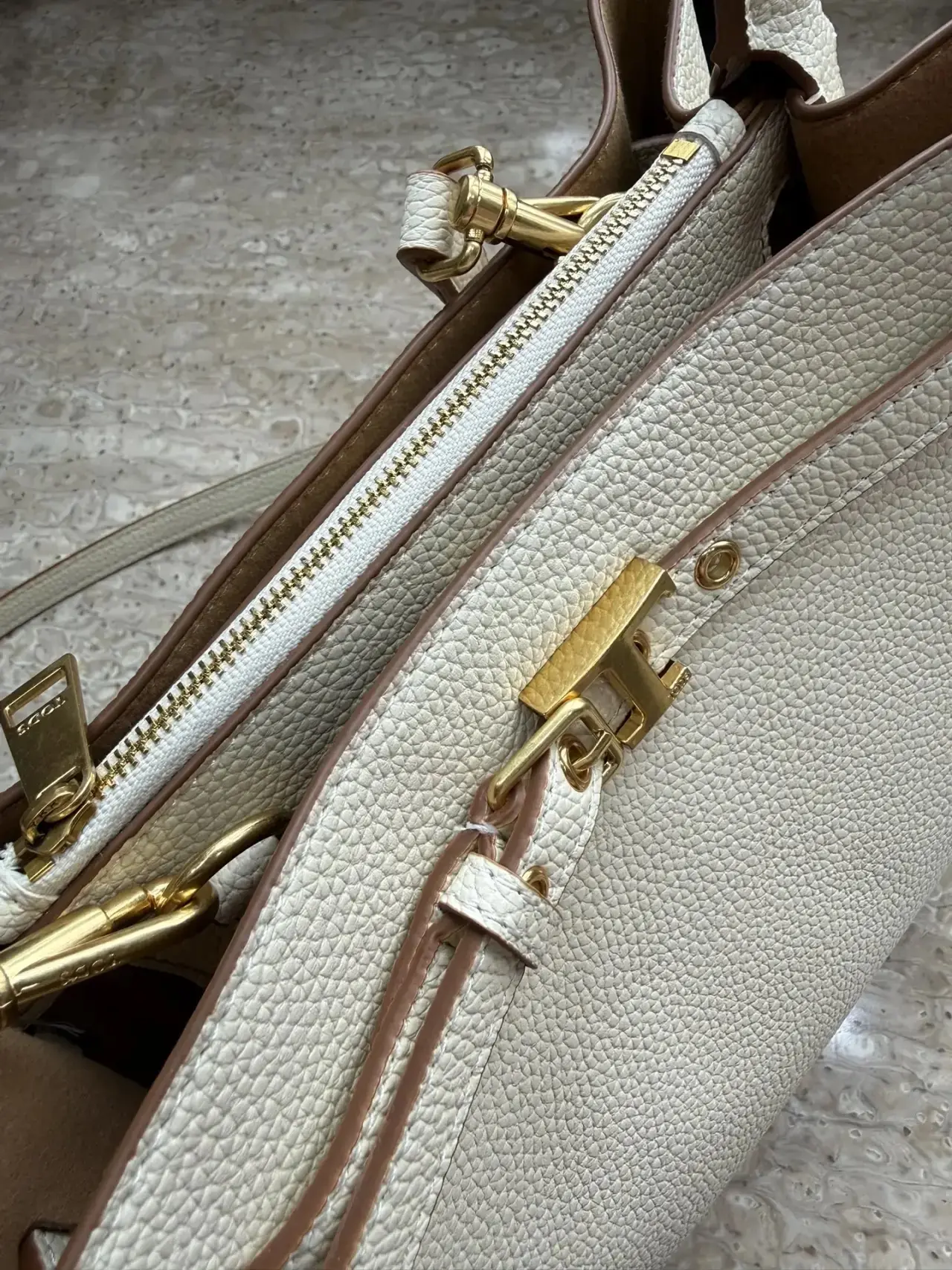 Я выбрала для себя бежевую кожаную сумку с золотой фурнитурой — и это именно тот аксессуар, который вписывается буквально в любой образ.
