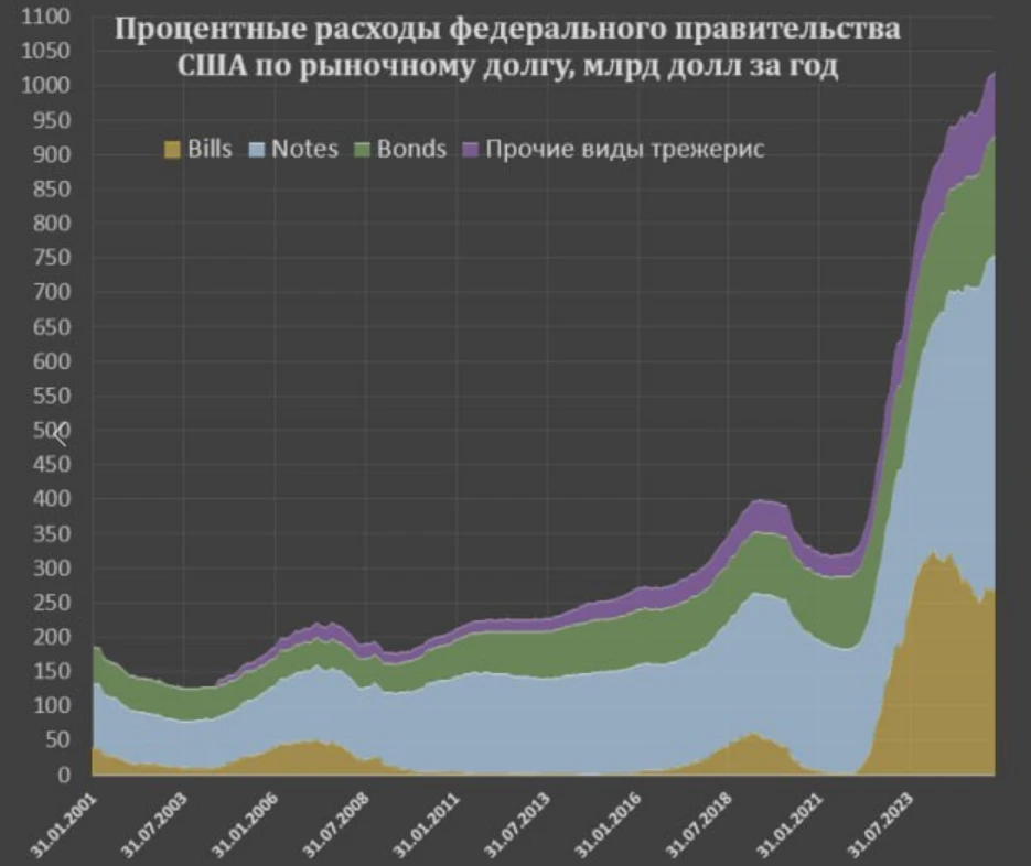 Это было лишь вопросом времени. И это «время» уже наступило. Годовые процентные платежи по госдолгу США в прошлом финансовом году перевалили за 1 трлн.$.